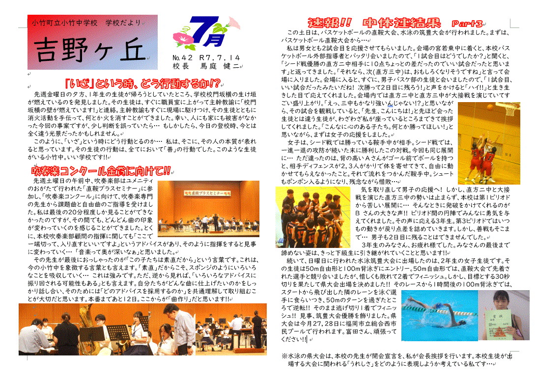 No.42 7月 14日 「いざ」という時の行動・ブラスセミナー・中体連結果