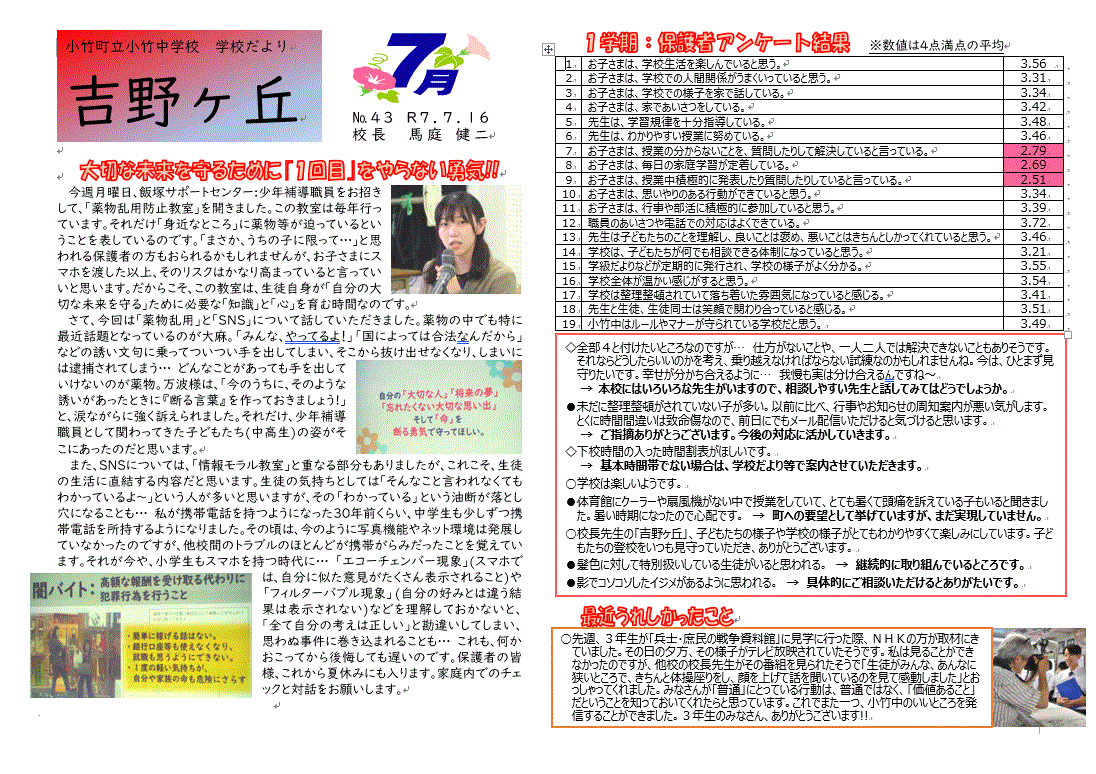 No.43 7月 16日 薬物乱用防止教室・保護者アンケート結果