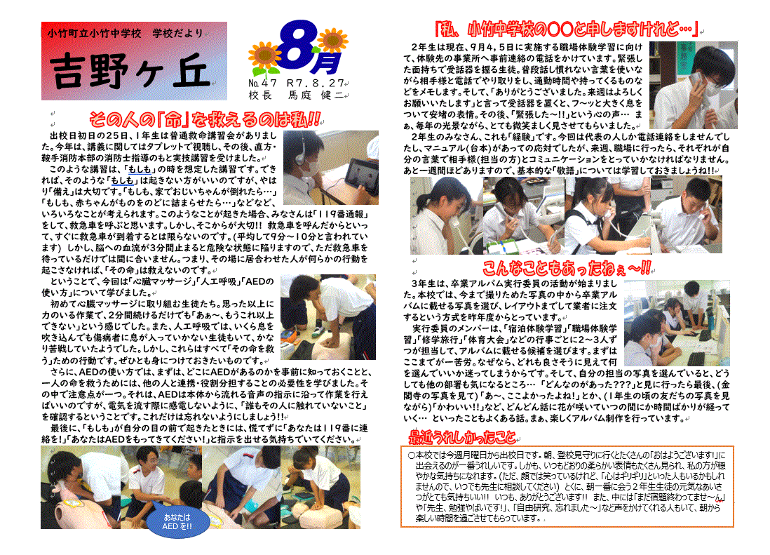No.47 8月 27日 1年普通救命講習会・2年職場体験事前取組・3年卒アル取組