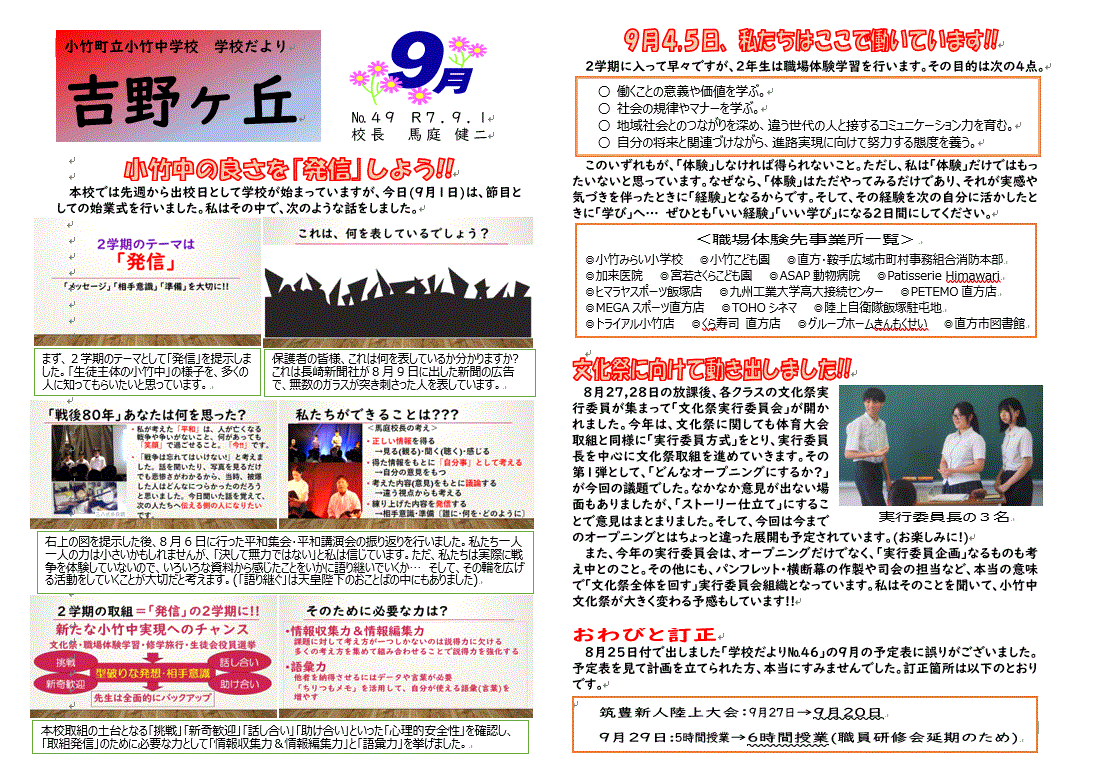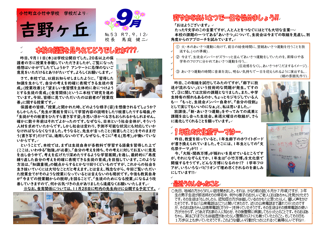 No. 16 9月25日(体育大会を振り返って・文化祭に向けて・テニス大会・教育実習)