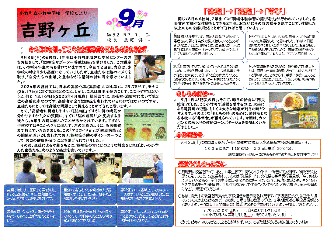 No.52 9月 10日 1年認知症サポーター養成講座・2年職場体験学習振り返り